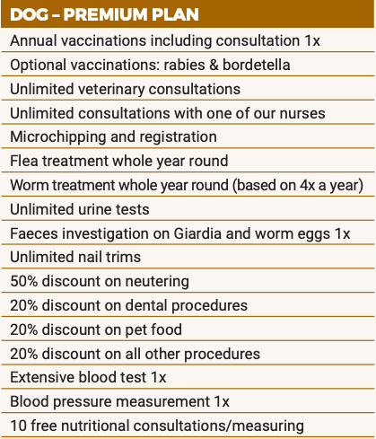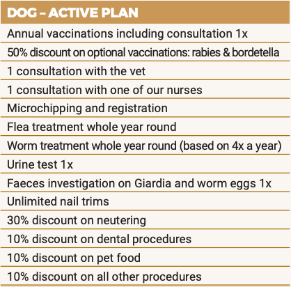 Preventive care and regular check-ups are very important for your dog’s health. That is why we have developed the Happy Pet Health Plan especially for your dog. This way, we can keep a close eye on your dog and you will not be confronted with unpleasant surprises. Take advantage of attractive discounts and convenience offered by the plan!